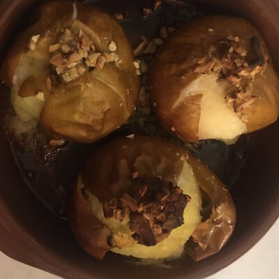 Wer mag, kann die noch warmen Bratäpfel mit einer Vanillesoße abrunden.