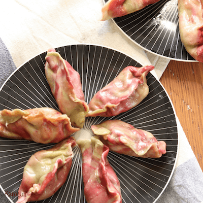 Mehl auf einer sauberen Arbeitsfläche verteilen und eine kleine Schale mit Wasser dazustellen. Um den Teig miteinander zuverbinden, die Hände anfeuchten, drei gleichlange 'Schlangen' formen und diese miteinander verpflechten. Die drei Stränge solange rollen bis eine schöne Farbstruktur zu erkennnen ist. Den Teig in gleichgroße Stücke schneiden, eine Kugel formen und jede rund ausrollen. Jeweils 1⁄2 bis 1 EL der Füllung auf den Teig geben und die Ränder mit nassen Fingern verkleben.
