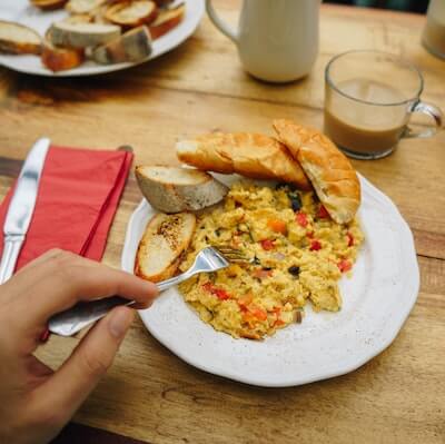 Die Zwiebel klein schneiden und das Fett in der Pfanne erhitzen. Den Tofu direkt über der Pfanne zerbröseln und anbraten. Die kleingeschnittene Zwiebel dazu geben und weiterbraten. Anschließend Kurkuma, Kala Namak und Pfeffer dazugeben und alles mit Sojasahne ablöschen.